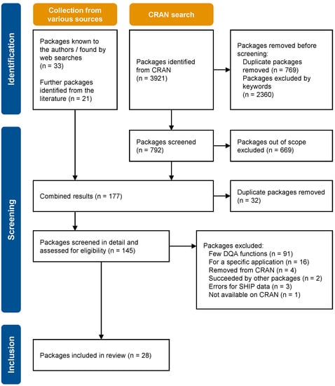 We refined the automated search during the process of package identification. Our final search strategy included six queries aiming at DQA, metadata use, and related concepts, which might incorporate DQ aspects (such as validating data, pre-processing, and exploratory tools). The search queries are reported in Appendix A. Duplicates within the search hits were removed using the R package dplyr [28]. To reduce the number of irrelevant packages, we compiled a list of exclusion terms (e.g., “air quality”) in an iterative process, with caution to not accidentally exclude relevant packages, and applied it to the description texts of the previously identified packages. The R script with our final search strategy and filtering steps is available at https://github.com/JoanyMarino/RPackages4DQA (search performed on 18 January 2022). One reviewer (E.K.) screened these search results based on the available metadata to exclude packages unequivocally unrelated to DQA (i.e., packages that address none of the domains of the reference DQ framework), packages for a specific type of data or single quality indicators (e.g., only to check digit distributions), as well as archived packages. However, we did not exclude packages for which these assessments were inconclusive at this step.