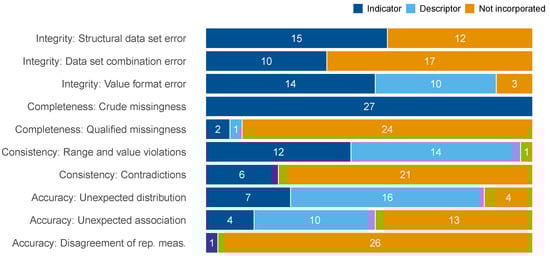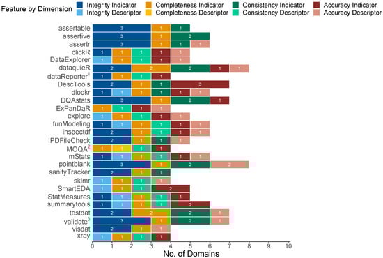 Number of data quality dimensions and domains for which inferences can be made based on the output of each of the 27 packages included in this review. For each package, the numbers correspond to the number of covered domains within each dimension. If a domain is covered by indicators and descriptors, the descriptors are not mentioned separately, yet Table A1–Table A7 provide the detailed information. identical with dataMaid, first published as mosaicQA, includes integration with errorlocate.