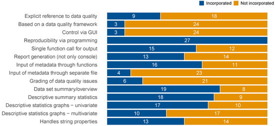 While exploratory data analysis overlaps with DQA, they are not identical. The former focuses on data properties and data descriptions in the broadest sense. In contrast, DQA is more concerned with measuring the “degree to which a set of inherent characteristics of data fulfils requirements” (ISO 8000 [23]). Thus, to perform DQA, it is not sufficient to rely on a complete data frame with study data. In addition, extensive metadata is needed to characterize further expected and required data properties (e.g., admissible values or ranges), as well as to identify deviations from the requirements [24]. Hence, software evaluation for exploratory data analysis provides only limited guidance on their ability to conduct DQA. Such a review of specific DQA capabilities of R packages is still missing.