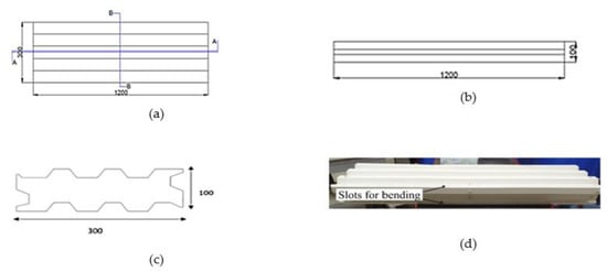 Overall dimensions of panel: (a) top view of the panel; (b) cross-section A-A; (c) cross-section B-B; (d) sample panels with a slot along the bents.