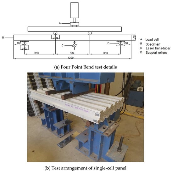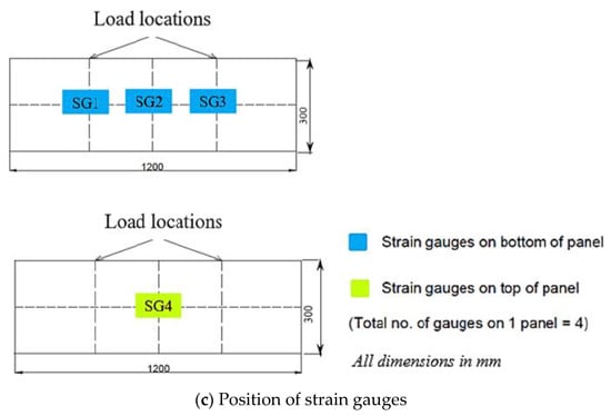 A four-point bending test was conducted on the infill composite floor slabs where the specimens had an effective span of 1000 mm, and the four -point bend test set-up and arrangement is shown in Figure 4a,b. The load was applied to the centre using a 500 kN capacity load frame, maintaining a displacement rate of 2.5 mm/min. The mid-point displacement was recorded using a laser transducer underneath the panel. Four strain gauges were placed on the panel, with three on the bottom side and one on the top of the panel to measure the strain data, as seen in Figure 4c. A data acquisition system connected to the load frame controls was programmed to measure the load, displacement, and strain data.