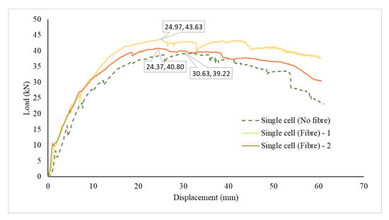 The load–displacement behaviour of the single-cell panels is shown along with ultimate load, and the gradual yield in Figure 5. The single cells with both types of infill material, namely SCGC and SCGC containing chopped basalt fibre, reported a gradual drop post the peak load, showing a ductile performance. The peak loads attained by all the single-cell specimens were in the range of 40 kN. However, the single cell with fibres recorded a slightly higher ultimate load-carrying capacity at an average of 42.22 kN. This signifies that the chopped basalt fibres have contributed to the load-carrying capacity of the panels by improving their ductility. The displacement is also higher at the ultimate load in a single cell with no fibres.