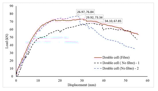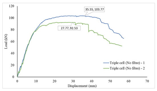 The load–displacement relationship of triple-cell panels is shown in Figure 7, reporting an average ultimate load of 98.15 kN. The ultimate load of the triple-cell specimen is also tabulated in Table 5. It is shown that the addition of any number of cells to the panels improves the load-carrying capacity of the floor slabs proportionally. This is mainly attributed to the overlap at the side of each cell. It is worth noting that the double- and triple-cell specimens have the same overall width of 600 mm, with a length of 1200 mm. The only difference is the additional partitioning, which led to a 35.6% increase in the load-carrying capacity. The influence of chopped basalt fibres in infill material for panels has been well established from the tests of single- and double-cell panels. Hence, the triple-cell panels were both tested without fibres.