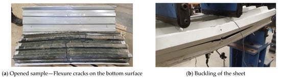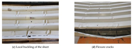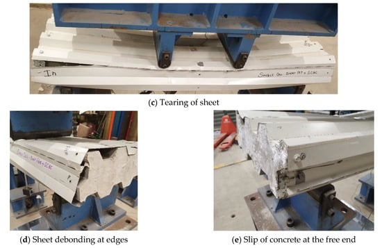 The primary failure mode in single-cell panels was flexure failure, and flexure cracks were also noticed under the loading points and at the centre of the panel (Figure 8a). This was initiated by buckling sheets at the edge, as seen in Figure 8b, which was followed by tearing the sheets at the slots, as seen in Figure 8c. The sheet was also seen to debond at the free end without the endplate and lose its integrity of shape (Figure 8d). This behaviour resulted in a slip of 1.4 mm between the concrete and steel at this end (Figure 8e). The panels were opened after testing to investigate the cracks in concrete. The load–displacement curve also translates the failure of sheets and the corresponding formation of cracks in concrete. Similar behaviours were seen for all panels without fibres. However, fewer cracks were noticed in panels with chopped basalt fibres due to their ductility, resulting in crack reduction.