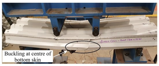 The measured strain values against the applied load for single-cell panels with chopped basalt fibres in the infill material are shown in Figure 10. It was found that the top skin remained in compression. In contrast, the bottom skin moved from tension to compression in the second sample, which could be due to the local buckling of the bottom skin, as shown in Figure 10 and Figure 11a.