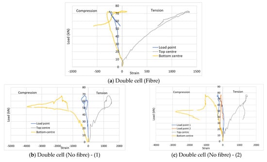 The strain mapping of the double-cell panels is shown in Figure 12. All the panels show that with an increase in loading, the mid-span of the bottom skin remained in compression, and the top skin remained in tension. In double-cell panels without fibres, a deviation in the curves was noticed when the panels underwent local buckling or tearing of sheets, which resulted in a drop in the strain value. The strain in the bottom skin of the double-cell panel with chopped basalt fibres was less than in the panels without them. It showed fewer variations due to the SCGC concrete combined with the chopped basalt fibres making the panels more ductile. No sudden or brittle failure was reported for the panels containing chopped basalt fibres in the infill. The strain mapping data of double cells with fibre indicates that the tensile properties of the deck were not completely utilised since the steel sheeting failed before the yield values of strain. However, double cells without fibre sufficiently utilised the full tensile capacity of the deck panels to attain the ultimate load.