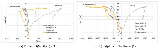 The two triple-cell panels tested without chopped basalt fibres showed similar behaviours, as presented in Figure 13. The top skin was in tension, and the bottom in compression. However, close to the ultimate load, when the cracks in concrete began widening, and the steel and concrete interface began to slip, a variation in the strain data on the bottom skin was noticed. The strain reduced and moved away from compression until the panel failed at the ultimate load. This also indicates that the neutral axis moved into the steel sheeting and part of the steel resisted the compression. The top skin yielded first and did not take any more load, whereas the bottom skin continued taking a steady amount of load after reaching the ultimate load until complete failure occurred. The strain mapping data depict that the strain values in tension reported lower values than those of the yield strength of steel sheets, indicating that the full capacity of the steel deck was not utilised.