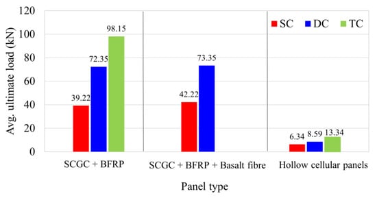 It can be seen in Figure 14 that a hollow single-cell floor panel reported only a 6 kN ultimate load, which, when filled with SCGC reinforced in BFRP, reported a six-fold increase in the ultimate load capacity. Moreover, the SCGC with chopped basalt fibre reinforced in BFRP reported a further 7% increase in the ultimate load for single-cell floor panels compared with samples without chopped basalt fibre additions with better ductility. A double-cell hollow panel reported an ultimate load of 8.59 kN which is eight times higher when filled with SCGC, chopped basalt fibres, and BFRP bars. This shows the relevance of infill material in improving structural performance. A similar trend was reported by triple-cell panels, where the ultimate load was increased seven-fold, reporting a peak load of 98 kN for panels with infill.