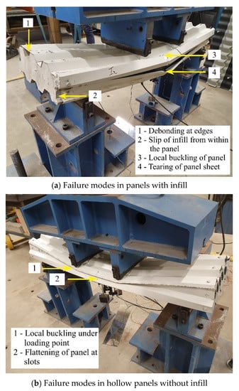 A comparison of the failure modes of different configurations of multi-cell and single-cell panels was also carried out for panels with and without infill. It was found that local buckling was the primary failure mode in hollow cell panels irrespective of the cell number. However, there was limited buckling under the loading points for the infill panels. The infill panels reported tearing and debonding of the sheet corners due to the slippage of hardened infill material from the steel in the panels during the test, which was not the case for the hollow panels. Despite wear and tear on the sheet surface, a significant load was transferred and held by the concrete until the flexural failure of the slab specimens containing SCGC infill. Major failure modes observed in infill panels and panels without infill are highlighted in Figure 15.