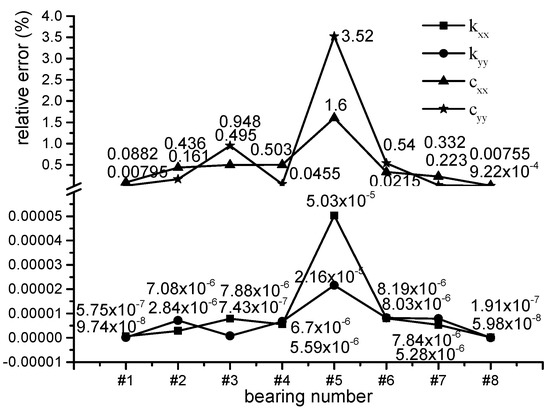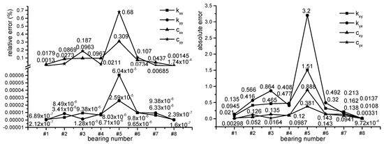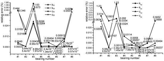 When #91 point, which is near #8 bearing, is used, the identification error of #8 bearing coefficients is the smallest among the eight bearings. The maximum relative errors of k8.xx and k8.yy, which are only 1.91 × 10−7% and 5.98 × 10−8%, respectively, almost equal zero. Moreover, the maximum relative errors of c8.xx and c8.yy are also almost equal to zero; although, they are bigger than that of k8.xx and k8.yy. They are only 0.00755% and 0.000922%, respectively.