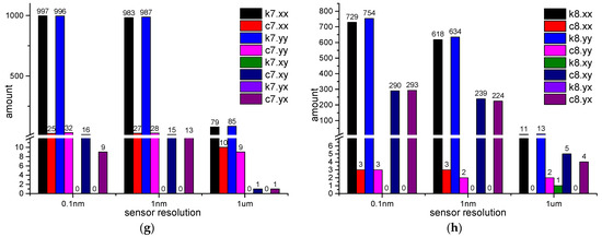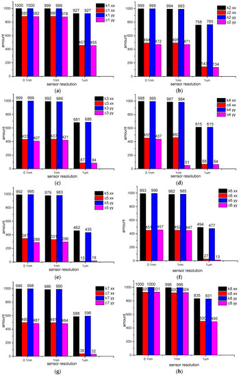 - The amounts of LEFPs decrease when the sensor resolution is reduced. In the computational example g4.4, when the sensor resolution is 0.1 nm, there is less than half of the LEFPs of the main stiffness coefficients of #3, #5 and #6 bearing. There are about seven hundred LEFPs of the main stiffness coefficients of #2, #4 and #8 bearing. There are about nine hundred LEFPs of the main stiffness coefficients of #1 and #7 bearing. When the resolution is 1 um, the number of LEFPs decreases to less than 100.