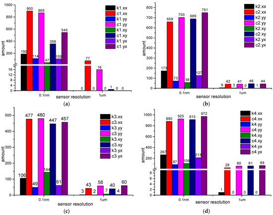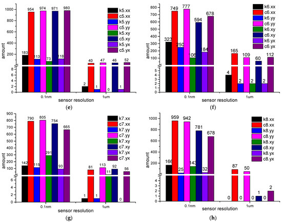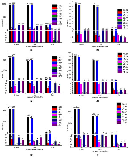 - The amounts of LEFPs decrease when the sensor resolution is reduced. Only several stiffness coefficients’ relative errors are bigger than 10% when the sensor resolution is 0.1 nm. However, when the sensor resolution is 1 um, nearly half of the frequency points at which the stiffness coefficients’ relative errors are bigger than 10% in the simulation of g4.4.