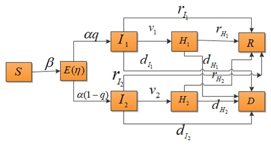 According to the classical compartment model of infectious diseases, the total population of an area is assumed to be N, the individuals within a population who can be classified susceptible is S, the number of exposed individuals is E, the number of mildly infected individuals is , the number of severely infected individuals is , the number of hospitalized and isolated patients with mild infections is , the number of hospitalized and isolated patients with severe infections is , the number of recovered cases is R and the death rate is D. In this study, it was assumed that the population was well mixed and had a fixed number of individuals and the vaccination of susceptible individuals was not considered. The probability of susceptible individuals becoming infected is independent of their age, gender, etc. This paper only considered contact infection, not immune loss. It was also supposed that the susceptible individuals would be infected with a probability of after contact with mildly or severely infected individuals. The decreasing proportion of infectivity during the incubation period was assumed to be and the incidence rate of exposed individuals was . When exposed individuals showed symptoms, they had a probability of q of becoming mildly infected or a probability of of becoming severely infected. and represent the isolation rates of hospitalized mildly and severely infected individuals, respectively. The model parameters are shown in Table 1 and the transformation relationship of populations is shown in Figure 1.