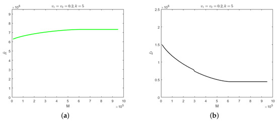 When the number of hospitalized and isolated severely infected individuals is less than M, the cure rate would be determined by the recovery period of the self-limiting infectious disease. When the number of hospitalized and isolated severely infected individuals is greater than M, the cure rate would decrease to and the mortality rate would be . The evolution results of the number of recovered cases and deaths when , under the above parameters, are shown in Figure 3.