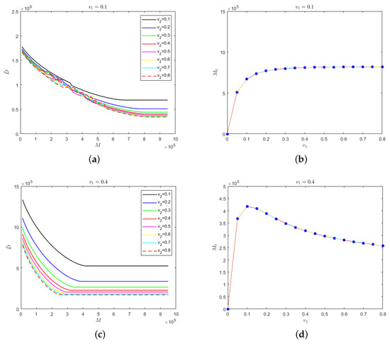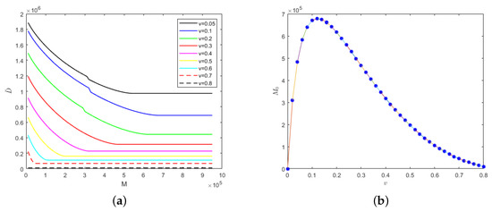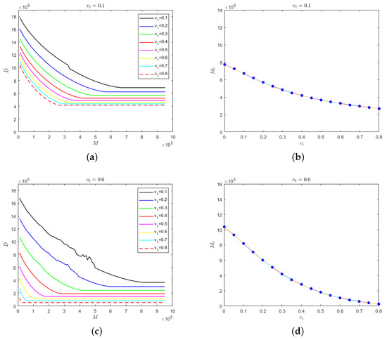 For self-limiting infectious diseases, the sum of the numbers of recovered cases and deaths is constant; so, the influence of the parameters and M on the number of deaths is considered below. First of all, we considered the case in which the isolation rates of hospitalized mildly and severely infected individuals were the same, i.e., . We let and Figure 4 shows the evolution results of the number of deaths according to medical resources at the different isolation rates of hospitalized individuals and the evolution results of safe medical resources according to those isolation rates.