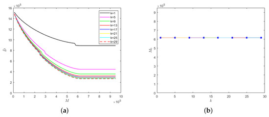 The lower the k value, the lower the cure rate and the greater the mortality rate of the hospitalized and isolated severely infected individuals. Therefore, the number of deaths would increase with the decrease in the k value, as shown in Figure 7a. Similarly, there would be different safe medical resource values for different k values. When the medical resources exceed the safe medical resource value, the number of deaths would no longer decrease but would stabilize. As can be seen from Figure 7b, when the recovery periods of different emerging infectious diseases are the same, then the safe medical resource values would also be the same. Therefore, for different emerging infectious diseases, the phenomenon of overwhelmed medical resources could be avoided when the value of M reaches the value of safe medical resources, which would provide theoretical support for medical institutions to reasonably allocate resources and be able to treat patients in time.