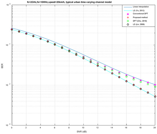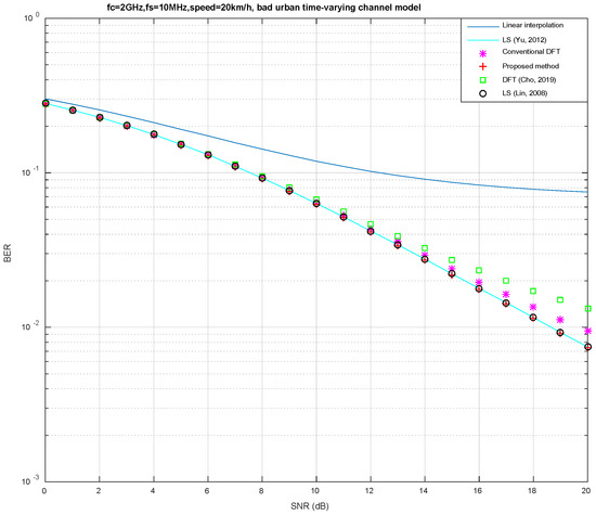 Let us consider a bad urban time-varying channel model [27] as shown in Table 6. The number of maximum channel delay points is equal to 100 and greater than Np/2. Therefore, the dimension of the estimated CIR for both LS methods [10,11] is set to the maximum value of the dimension, which is . But in this case, the matrices in both LS methods [10,11] are getting closer and closer to singular. The regularization parameters of [10,11] are set to 0.00005 and 0.05, respectively. For fair comparison, the proposed method, the DFT method, and [8] also take the first points of the estimated channel impulse response as the final estimated channel impulse response. Figure 5 shows the simulation results with speed equal to 20 km/h. The six curves in Figure 5 are all becoming worse than those in Figure 2. The numbers of maximum channel delay points in bad and typical urban channel models are 100 and 50, respectively. The larger the maximum channel delay, the worse the channel estimation efficiency of linear interpolation will be. Therefore, the linear interpolation curve in Figure 5 is obviously much worse than that in Figure 2. Since the matrices are getting closer and closer to singular in the two LS methods, although the regularization parameter is used, it still makes the two LS curves in Figure 5 worse than those in Figure 2. The estimated CFRs at the virtual pilot subcarriers with our proposed method will be inaccurate when the number of maximum channel delay points is larger than Np/2. Therefore, the curve of our proposed method in Figure 5 becomes worse than that in Figure 2. However, the curves of the two LS methods and our proposed method still overlap in Figure 5. This shows the channel estimation efficiency of our proposed method is still similar to those of the LS methods [10,11], even if the number of maximum channel delay points is greater than Np/2.