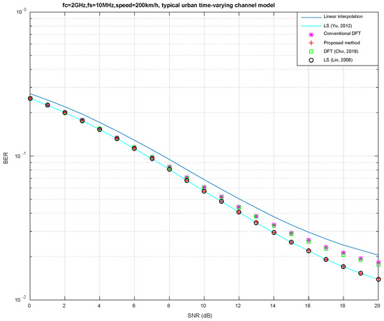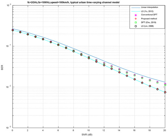Figure 3 and Figure 4 show the simulation results with speeds equal to 100 km/h and 200 km/h, respectively. At low SNR, the six curves did not change from Figure 2, Figure 3 and Figure 4 as the effect of noise was higher than speed. At high SNR, the six curves from Figure 2, Figure 3 and Figure 4 all deteriorated with increasing speed as the effect of speed was higher than noise. Since the channel changes were extraordinarily slow, it can be assumed that the channel is approximately invariant within an OFDM symbol when speed is very low. The channel was no longer approximately invariant within an OFDM symbol when the speed is very high. Therefore, the simulation results at high speed are worse than the simulation results at low speed when SNR is high. The BER curves of the LS methods [10,11] and the method proposed in this paper are still overlapped in Figure 3 and Figure 4.