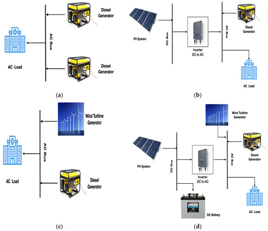Schematic diagram of the proposed hybrid energy system for different configurations. (a) Case 1: Diesel generators only. (b) Case 2: Diesel generator with wind turbine. (c) Case 3: DG with PV system. (d) Case 4: DG, PV, wind turbine and battery.