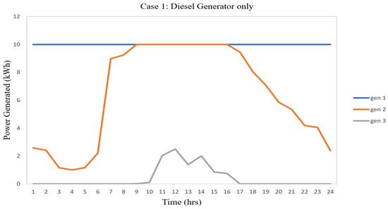 Case 1: In this case study, the healthcare facility loads are supplied through the diesel generators with a peak capacity of 10 kW per generator, because it is designed such that no other source is available. The behavior of the three generators based on their power output is presented in Table 4. It is observed that the first generator operates at its peak capacity daily, while the second generator only reach its peak capacity when the hospital load is at its peak demand between 09:00 to 16:00 h each day. The third generator serves as a power reserve to support the power generation when both generators cannot meet the peak load demanded by the healthcare facilities at the peak period of the day as shown in Figure 1.
