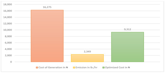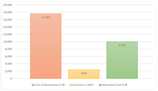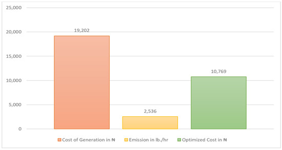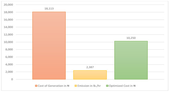 Figure 3 presents the optimal power produced from diesel generators and Figure 4 presents the performance evaluation of the economic and emission parameters of this configuration. Since there is no other alternative source to supplement the diesel generators during operation, a large cost is incurred from the continuous operation of multiple diesel generators. Therefore, the minimized cost of running the three diesel generators is NGN 10,769/kWh. The environmental implication of running the three generators shows that this configuration produces an emission of 2536 lb/h. The high emission value obtained illustrates the environmental impacts the diesel generators have on the rural community.