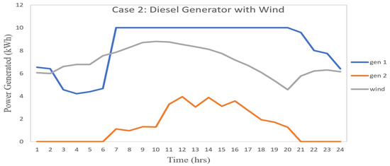 Case 2: This configuration uses diesel generators and wind turbines to meet the healthcare facility load. Table 5 presents the daily behavioral pattern of the diesel generators and the wind turbine generator. It can be observed that the integration of a wind turbine generator reduced the number of diesel generators in operation as shown in Figure 5. This in turn will reduce the level of degradation of the diesel generators as less stress in their operation reduces wear and tear. The economic and emission performance of the system can be seen in Figure 6. It shows that the operating conditions of the system considerably improved when compared to a system with only diesel generators in operation. The operational cost of running the system drastically reduced to NGN 9994/kWh and the emission sequentially reduced to 2385 lb/h because less generators are utilized and wind turbine generation produces no air pollution.