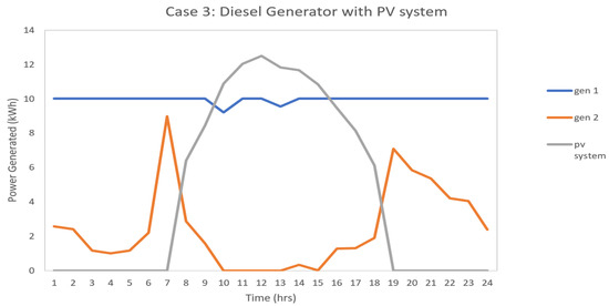Case 3: In this case study, a solar PV system is added to the diesel generators to meet the required load demand of the rural clinic. Table 6 presents the power generated by the diesel generators and PV system. The results obtained in Figure 7 show that the power produced by the diesel generators significantly reduced owing to the presence of the PV system. However, there were inconsistencies in the availability of the PV system, which poses a setback to the configuration. The power produced from PV is only available between 08:00–18:00 h daily due to the intermittent nature of solar irradiance. In this case study, two diesel generators operated at minimal capacity. The cost of operation of this configuration is NGN 10,250/kWh and it is slightly lower when compared to a system mainly run by diesel generators. The environmental assessment shows a further reduction in emission production at 2387 lb/h as shown in Figure 8.