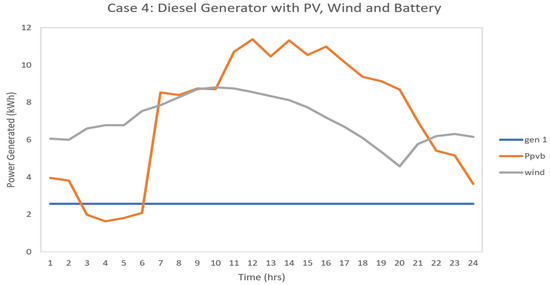 - Case 4: Diesel generator, PV, wind turbine and battery.