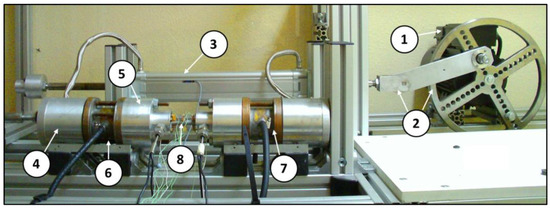 Figure 1. Experimental test bench composed of 1: electrical motor, 2: cylinder and crank shaft, 3: pneumatic cylinder, 4 and 5: connecting tubes, 6: hot heat exchanger (HHEX), 7: cold heat exchanger (CHEX), and 8: regenerator under test.