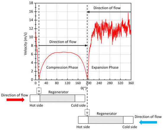 The hot side represents the volume between the regenerator and the hot exchanger, and the cold side is between the regenerator and the cold exchanger. The time corresponding to the minimum value of the velocity (u) is taken as a reference for the starting point of the compression phase or the expansion phase (reverse phase) of the fluid flow.