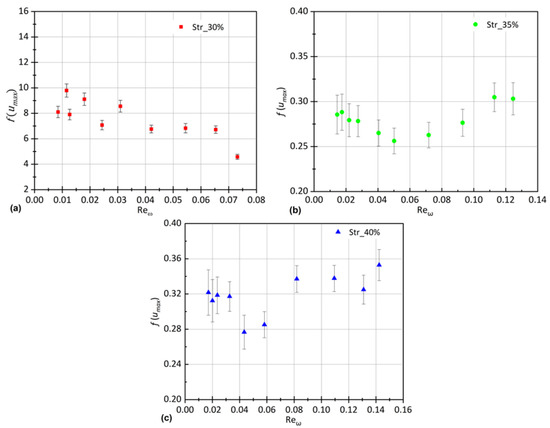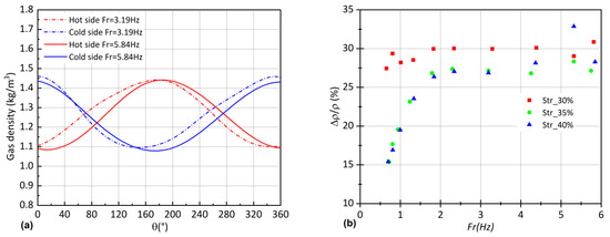 In this paper, we only present the temperature evolution measured at each side of the regenerator. The effect of frequency on the temperature is plotted in Figure 7 for three types of regenerators, Str_30%, Str_35%, and Str_40%, at a length of L1 = 60 mm.