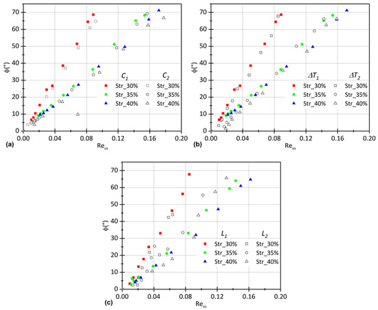 Figure 16. Evolution of the phase shift   ϕ   for each regenerator ((a): Str_30%, (b): Str_35%, (c): Str_40%) as a function of the kinetic Reynolds number Reω for different strokes (C1 = 64.4 mm and C2 = 128.4 mm), lengths (L1 = 60 mm and L2 = 70 mm) and temperature gradients (ΔT1 = 70 °C/10 °C and ∆T2 = 40 °C/10 °C).