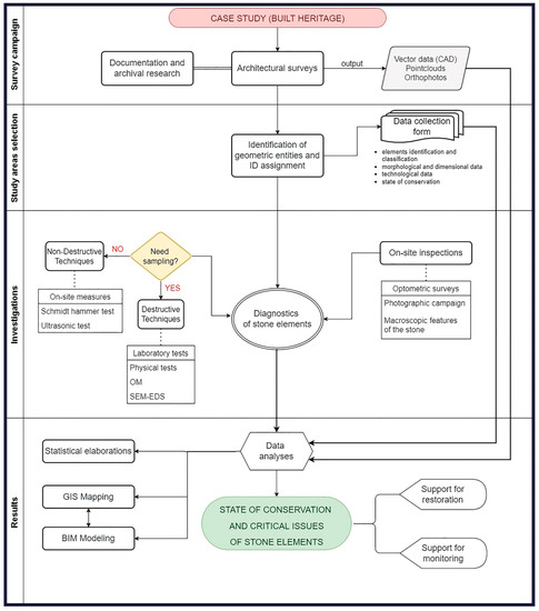 The need to develop a methodology for documentation, diagnostics, and monitoring of built heritage has been the subject of many recent studies [2,3,4,5]. The approach of these studies is for a digital documentation of the conservation state of buildings [2,3], including 3D modelling and GIS mapping, and the integration of diagnostics data through a knowledge-based information system [4] or within building information modeling (BIM) [5] for documenting damages to built heritage. Nevertheless, there are still challenging research topics to address: in particular, the multidisciplinary integration of tools and methods used in different fields and/or with different purposes, and the multi-level correlation of data by different analytical and experimental documents and sources aimed at a complete characterization of stone weakness. This work proposes the application of an integrated methodology for a complete characterization of the stone materials of the architectural heritage, from the architectural survey and mapping of decay phenomena to physical-mechanical and mineralogical investigations. The aim was to associate the competences acquired for setting a diagnostic program based on measurements with both experimental and traditional techniques, and on the collection, analysis, and interpretation of the results associated to these measurements.