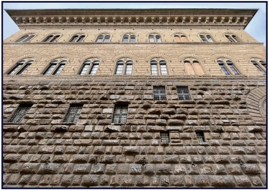 - Millen, R.F.; Wolf, R.E. Palazzo Medici into Palazzo Riccardi: The Extension of the Façade along via Larga; Mitteilungen des Kunsthistorischen Institutes: Florenz, Italy, 1987; Volume XXXI, pp. 81–120. [Google Scholar]