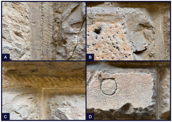 Different types of joints between blocks and finishes: (A) vertical joint with traces of chisel; (B) corner joint with traces of subbia; (C) joint between three blocks with traces of subbia; and (D) ashlar with trace of the stonemason.