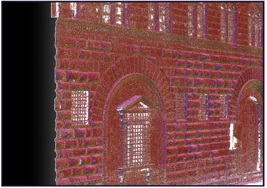 The scanner has been set with a resolution of 1/4 and a quality of 4×, settings that allow a good quality of the data acquired in a range between 10 and 15 m. However, to have a greater definition of detail, scans were made every 5 m. The cloud was also verified with a partial survey conducted with a total station. The superimposition of the instrumental outputs has allowed the preparation of a digital model from which to extract orthophotos of the elevations and vector outputs to obtain detailed data (Figure 6).