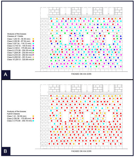 The distribution of single or combined characteristics was analyzed both through statistical processing (graphs, tables) and through thematic mappings on the facades, drawn up starting from the architectural survey. At the same time, a process of conversion of the data into a single evaluation scale was started, in view of the construction of vulnerability matrices [45]. The analyzed data were represented graphically to obtain a mapping of their distribution on the portion of the facade under examination (Figure 7A,B). One of the data clusters considered is the dimension of the bosses’ projection. Once divided into classes, it was possible to obtain a graphic distribution that highlighted a uniform distribution attributable to three macro classes (Figure 7B).