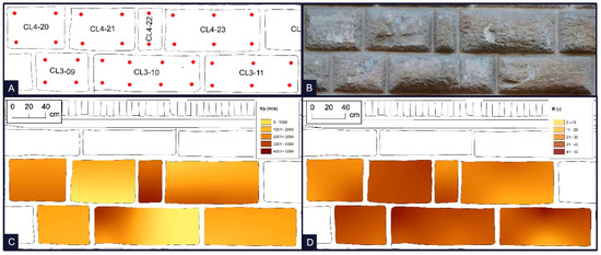 (A) Measurement scheme followed for NDT, outlined on a block portion; the red dots represent the grid of measuring points where the ultrasonic and sclerometric measurements were performed (B) portion of rough-hewn rustication investigated; distribution maps of (C) Vp values and (D) R values processed through GIS software.