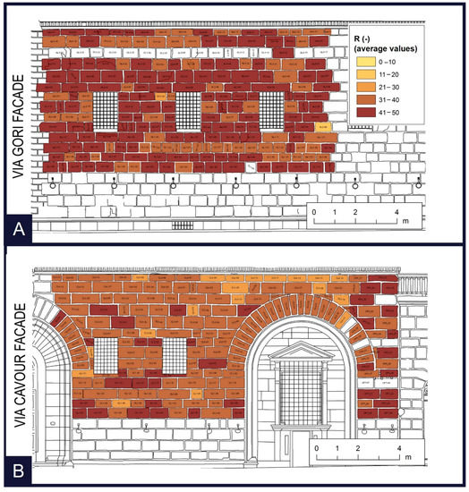 R values lower than 30 indicate that the surface is exfoliated or broken, or that the element under investigation has portions of loose material. Only 17 elements out of 368 have R values under 30. Although R values show that the investigated blocks are in a good state of conservation, it is possible to observe that the facade on Via Gori has better surface characteristics (Figure 10).