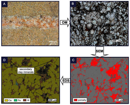 Observation of the petrographic and mineralogical features of a reddish carbonate filling by the combination of different analytical methodologies: (A) stereomicroscope; (B) plane polarized light OM; (C) backscattered electrons (BSE) SEM image reprocessed with feature identification analysis software to quantify and map the sample porosity; and (D) EDS map showing the distribution of Ca, Fe, and Al.
