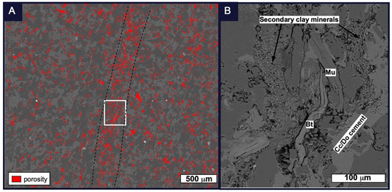 (A) Backscattered electrons (BSE) SEM with an overlapped porosity mask highlighting the preferential pore concentration along laminations (dashed lines). (B) Enlarged view of the lamination (white rectangle in A) showing the textural relationships of primary phyllosilicates and secondary clay minerals with respect to clastic particles and carbonate cement. Bt = biotite; Mu= muscovite; Cc = calcite; Do = dolomite.