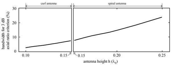 The frequency bandwidth for a 3 dB axial ratio criterion against the antenna height h is presented on the right side of Figure 3. The optimized parameters (C, d, Lf) on the right side of Figure 2 are used. The axial ratio bandwidth decreases as the antenna height is reduced. A bandwidth of 24% at h = 0.25λ0 decreases to 8% at h = 0.15λ0.