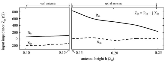 The left part of Figure 4 depicts the input impedance Zin = Rin + j Xin for a smaller antenna height than h = 0.15λ0. The curl has an input impedance of 80 − j 200 Ω at h = 0.10λ0, which gives a high VSWR (of 12 to a 50-Ω coaxial line). In Section 3.2, impedance matching is considered.