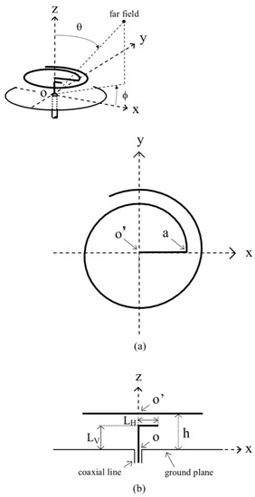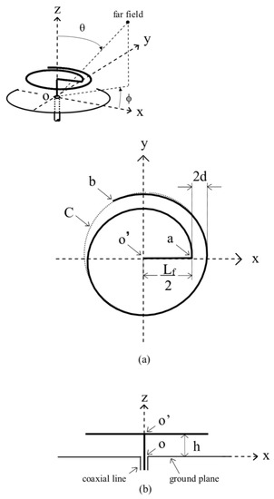 Figure 5 shows the configuration of a curl antenna. The antenna is made of a wire of radius ρ, which is bent at height h and curled above the ground plane. The antenna consists of vertical (o-o′), horizontal (o′-a), and curled (a-b) parts. The Archimedean spiral function defines the curled part, with its center being at point o′. The length of the horizontal part (o′-a) is given by as · ϕst = Lf/2. The curl’s outer circumference and adjacent arm distance are given by 2πas · ϕend = C and 2πas = 2 d, respectively. Note that the definitions (C, d, Lf) used for the two-arm spiral antenna shown in Figure 1 apply to the present curl antenna. The antenna is fed by a coaxial line at the lower end of the vertical wire, at point o.
