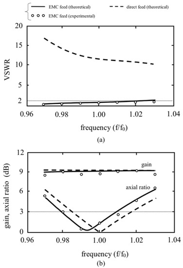 The solid lines in Figure 7b show the frequency responses of the axial ratio and gain. The axial ratios are less than 3 dB in a frequency range of 0.980f0 to 1.007f0 (3% CP wave bandwidth), within which the gain is almost constant (9 dBi). This CP wave bandwidth is the same as that for the direct feed (see the dotted line for the direct feed). The experimental results are also presented in this figure. Good agreement is seen to exist between the theoretical and experimental results. The axial ratio and gain are measured in an anechoic chamber using broadband (Q-par Angus) and standard gain horn (Narda 644) antennas. We use the vector network analyzer as a transmitter and receiver to determine the radiation phase for evaluating the axial ratio. Note that the antenna does not have a conventional lossy dielectric substrate. Therefore, the radiation efficiency is almost 100% (up to 12 GHz with negligible conductor losses [18]).