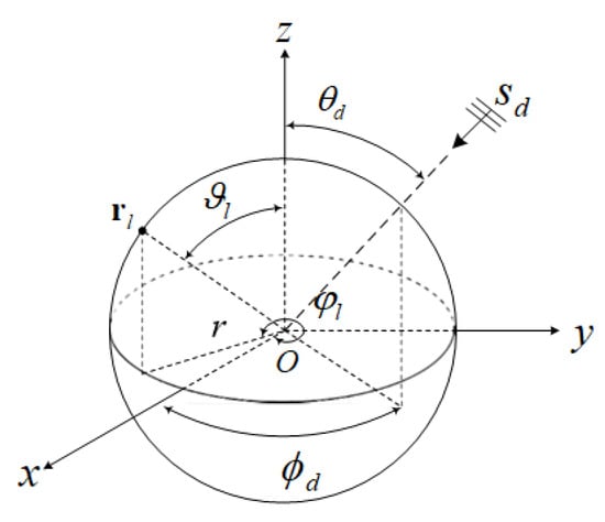 An acoustic far-field signal emitted from the location is supposed. The distance between the source and the center of the spherical microphone array is , and and mean the elevation and azimuth of the d-th source, respectively. Thus, the output vector of the spherical microphone array can be obtained as