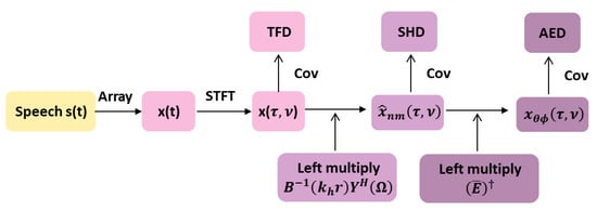 This section introduces the input features of the proposed method for the DOA task. As shown before, three different covariance matrices are considered as the input features for the neural network. The first covariance matrix is the covariance matrix of the received signal of the microphone array in the time–frequency domain (TFD). The second one is the covariance matrix of the signal in the spherical harmonic domain (SHD). The third one is the covariance matrix of the signal in the azimuth–elevation domain (AED). All the covariance matrices are to be introduced in detail.