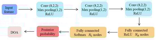 The estimation is treated as a classification task. The whole space is divided into different classes and the emitted signal detects which class the signal belongs to. The elevation space, ranging from to , is divided into 13 different classes with the interval of Similarly, the azimuth space, ranging from to , is divided into 36 classes with the interval of In total, 468 different classes can be obtained. Moreover, each class is granted a label to distinguish it. For each class, a large number of samples are generated for the network to learn and give the network the ability to localize the sound source. For the classification, a convolutional neural network is utilized for the task. The network is composed of three convolutional layers and two fully connected layers. For the convolutional layers, the size of the convolution cores in these three convolutional layers is 2 × 2. Moreover, the number of filters in all layers is fixed at 8. All the convolutional layers are activated by the rectified liner unit (ReLU) activation [32]. A flattened layer follows the last convolutional layer to reshape the output of the convolutional layers. The following components are two fully connected (FC) layers. The first layer with nodes is activated by the ReLU activation. The second layer with nodes uses softmax for the activation. is the number of classes for the task. The softmax function [33] helps to obtain the posterior probabilities of all the candidates. Finally, according to the principle of maximum posterior probability, the position where the maximum probability occurs is the estimated DOA. Figure 3 demonstrates the details of the network for the estimation task. During learning, the cross-entropy [34] is chosen as the loss function because its derivation is simpler and it is only related to the probability of the correct class. Furthermore, the loss is able to conveniently derive the input of the softmax activation layer. Adam [35] is adopted for the stochastic optimization. The details of the CNN are shown in Figure 3.