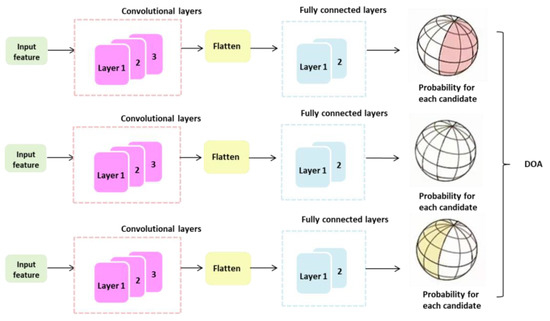 Take Figure 4a as an example. The pink part is the first sub-space used for the first CNN. The space range for the pink part is from to , thus, 169 classes can be obtained for the first CNN. As the other blank parts are irrelevant spaces, a new class is needed in this subtask. This class represents irrelevant sound, which means that the signal comes from irrelevant areas. This feature should be used as the input of the other two networks to determine the location, the signal does not appear in this sub-space. Thus, 170 classes are considered for the first sub-CNN. Similarly, the second sub-space, ranging from to , also has 170 classes. The third sub-space also has this, whose range is from to .