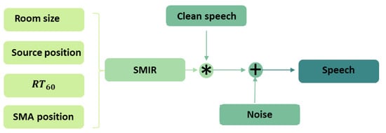 In this section, the simulated and real datasets for the algorithm are introduced. For training, a large number of data are needed; however, in practice, it is time-consuming and less cost-effective to sample the data. Thus, simulating data can be taken into consideration for comprehensive training. A variety of simulated environments can be obtained by using SMA response (SMIR) [36]. The SMIR is decided by the size of the room, the locations of array microphones and sound sources and the reverberation time (). Figure 6 shows the flow chart of the process of the simulated dataset generation.